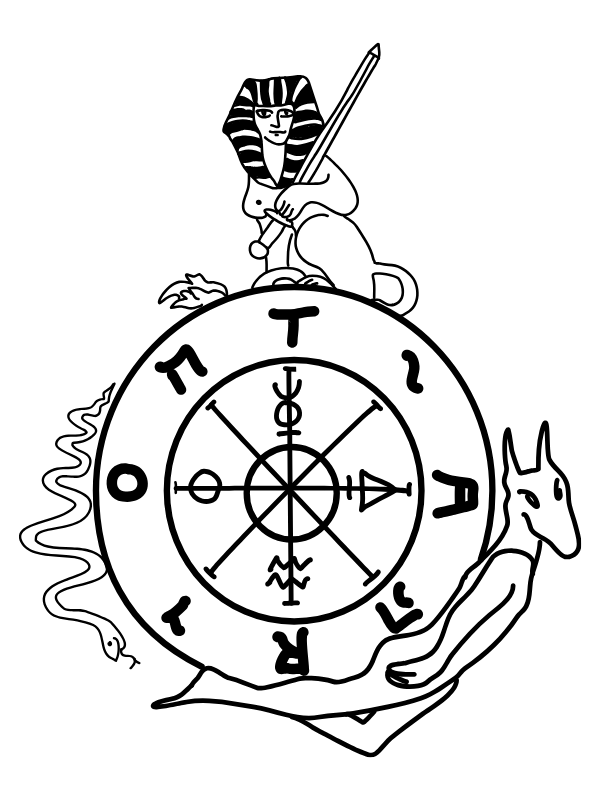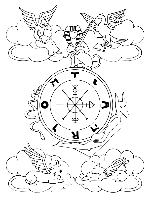 These also correspond to the four evangelists in Christian iconography. The wheel itself is inscribed with alchemical symbols and sometimes the letters T-A-R-O, forming a cyclical loop.